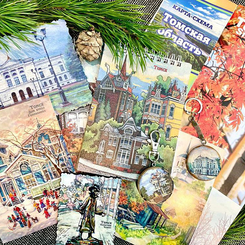 Сувенирный набор: блокнот деревянный, магнит деревянный, открытка деревянная с подставкой, эко-ручка, ароматизатор для машины — все с достопримечательностями Томска.